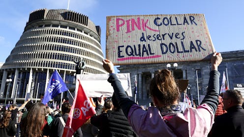 Pay equity protest outside parliament on budget day, May 22 2025. Getty Images In 1936, when the National Party was